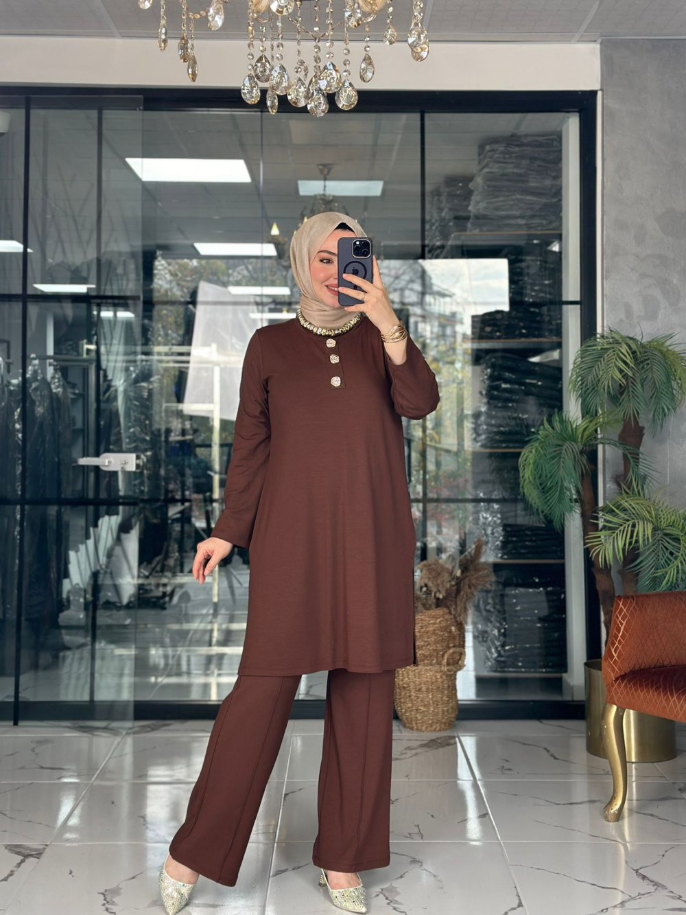 Kumaşı likralı örme kumaştır. Tunik önündeki düğmeler süstür.