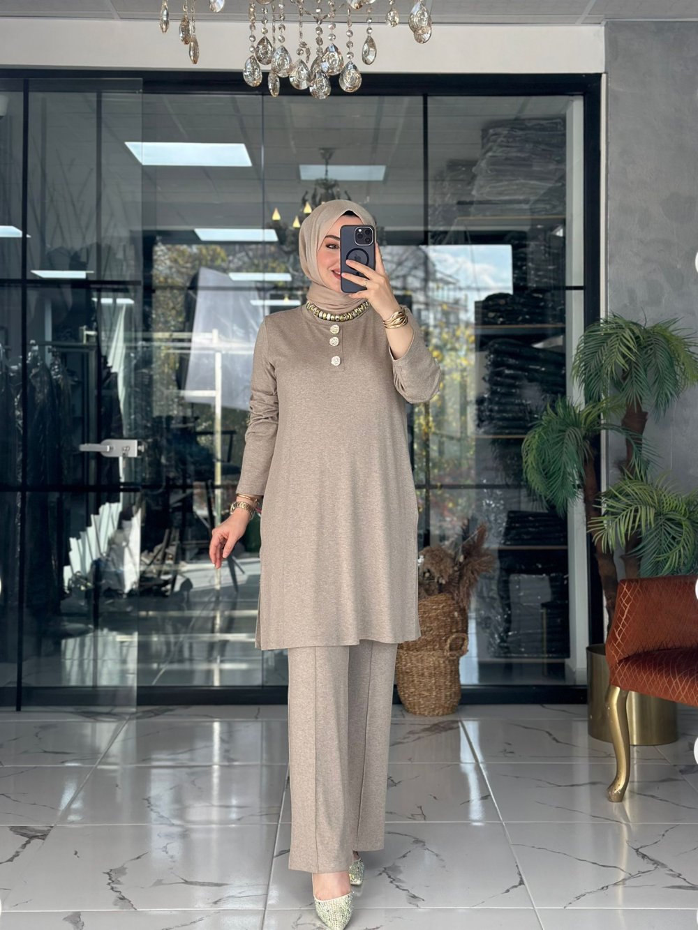 Kumaşı likralı örme kumaştır. Tunik önündeki düğmeler süstür.